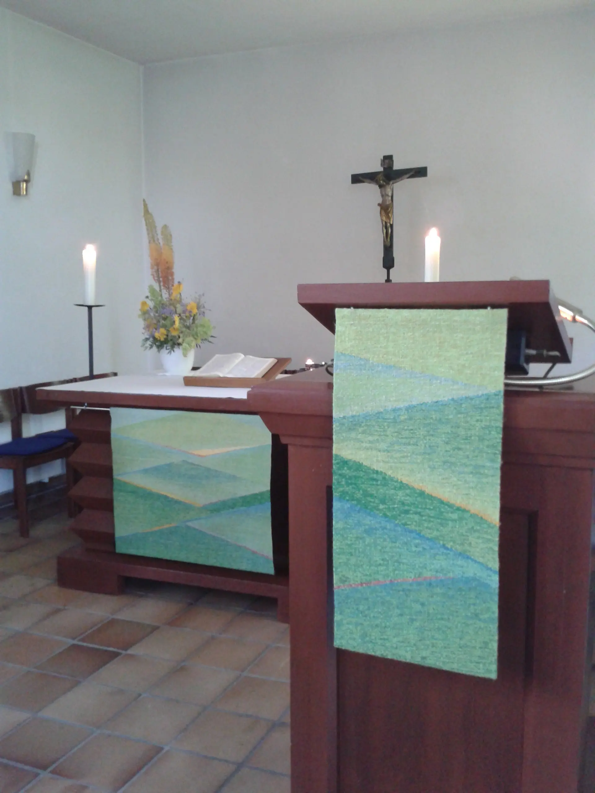 1985 Ab dem Herbst zeigte die Stirnwand unserer Kirche einen Wandteppich, dessen Gestaltung durch die Entwürfe eines früheren Kirchenvorstands geprägt wurde. Die Duchführung, bestehend aus Wolle vom Erzeuger kaufen, waschen, kämmen, spinnen und einfärben wurde durch großes Engagement der Ehefrau eines früheren Pfarrers sowie vieler Gemeindeglieder in mehr als 900-stündiger Arbeit abgeschlossen.