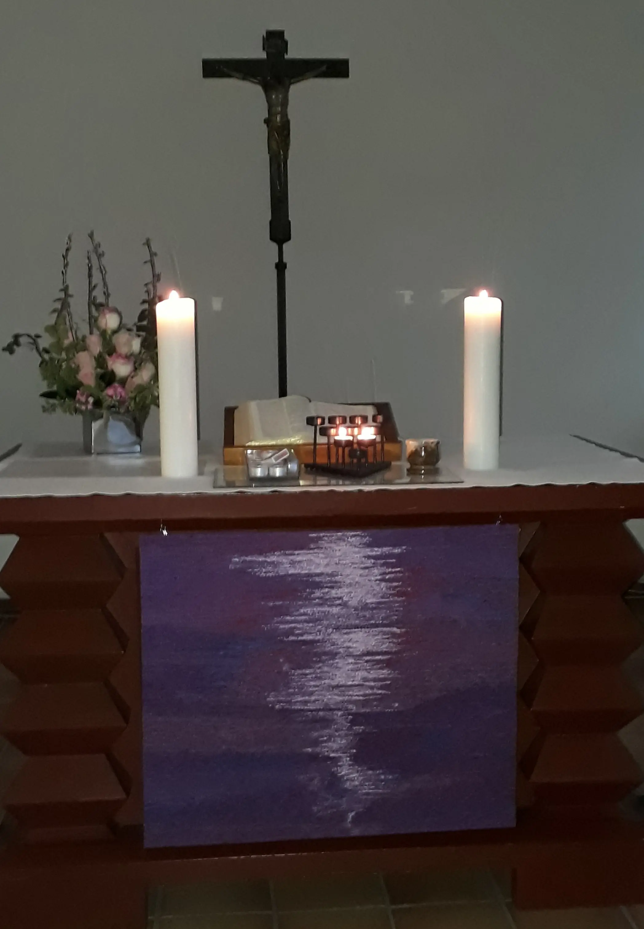 Die violetten Paramente für die Passions- und Adventszeit wurden im Gottesdienst am 01. März 2020 begrüßt. Die Paramente (Paramente kommt von lat. parare mensam - den Tisch bereiten) für Altar und Kanzel wurden wie bereits die grünen Paramente in der Ratzeburger Paramentenwerkstatt nach Entwürfen von Kathrin Niemeyer gefertigt. Die Paramente sind aus Schurwolle und Leinen in Gobelintechnik von Hand gewebt.