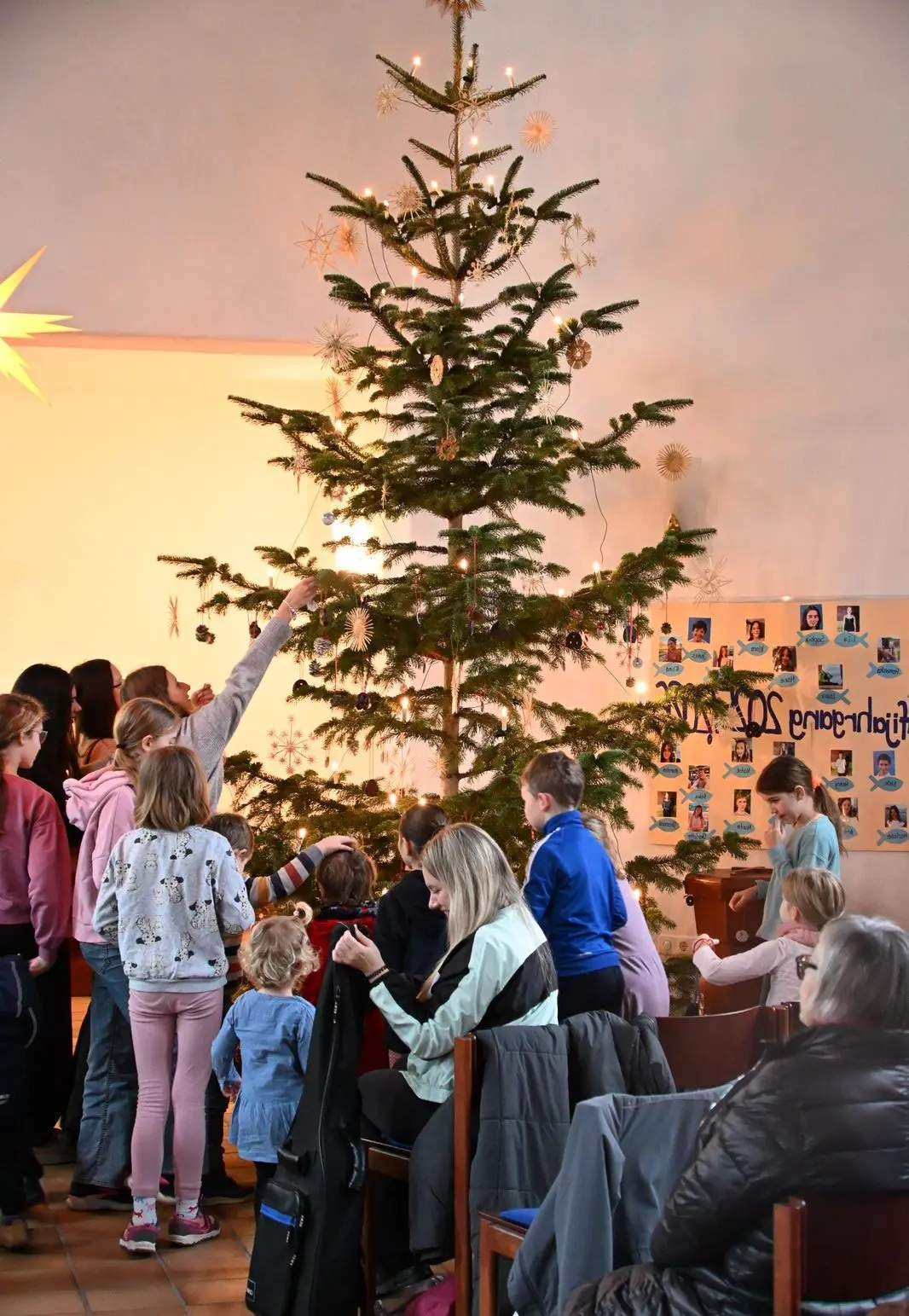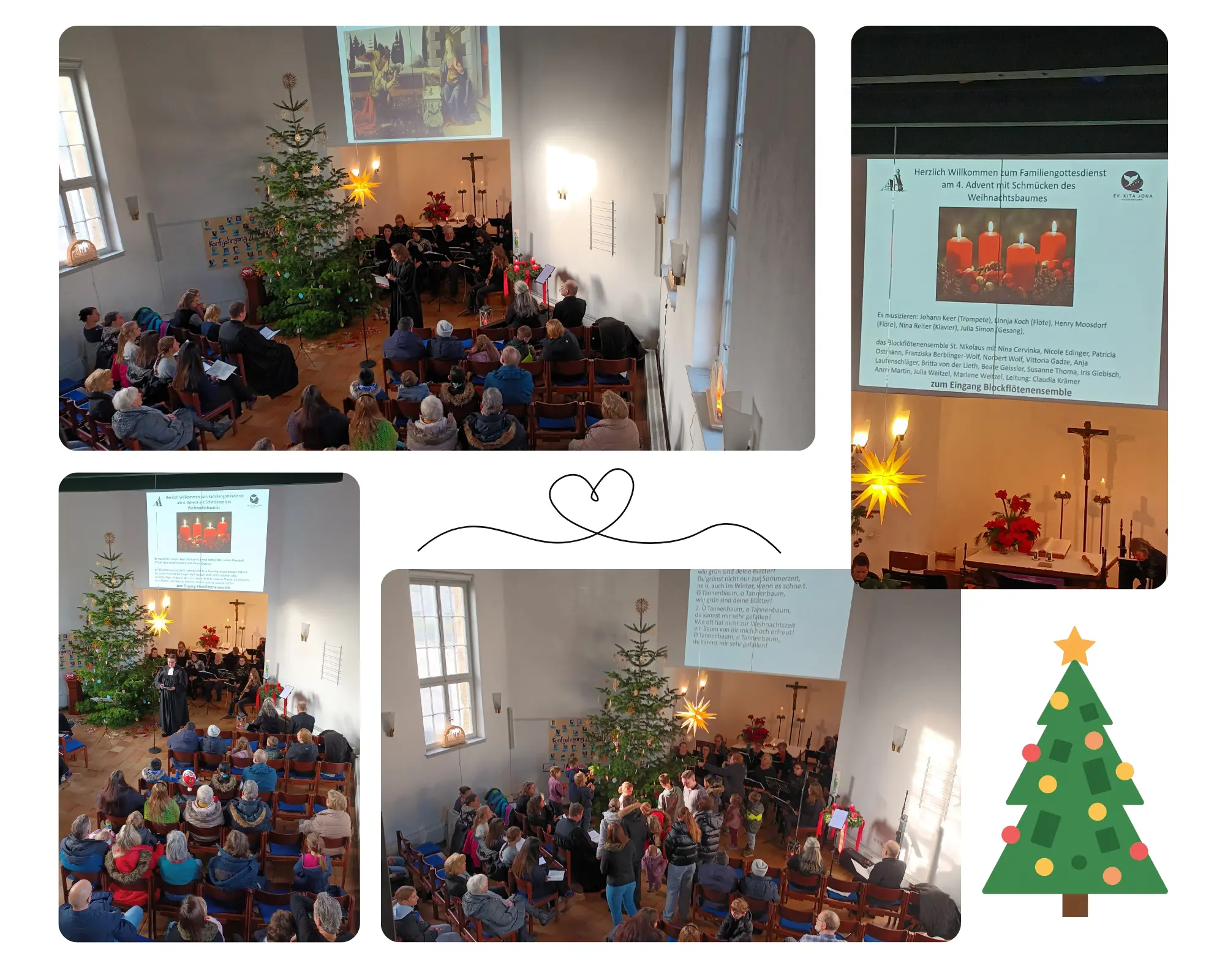 Im sehr gut besuchten Baumschmück-Gottesdienst am 4.Advent zeigten Kinder und Jugendliche ihr musikalisches Können. Die Besucher hörten vorgetragene Stücke auf der Querflöte, Flöte, Klavier, Trompete und Gesang. Zum Schluss konnten alle Kinder den wunderschönen Weihnachtsbaum mit Selbstgebasteltem schmücken. Der Baum stammt vom Gelände des Familienzentrums, wo er aus Platzgründen gefällt werden musste. Der Gottesdienst mit Pfarrerin Susanne Winkler und Vikar Marvin Trebbien wurde vom Blockflötenensemble St.Nikolaus aus Rodgau umrahmt.
