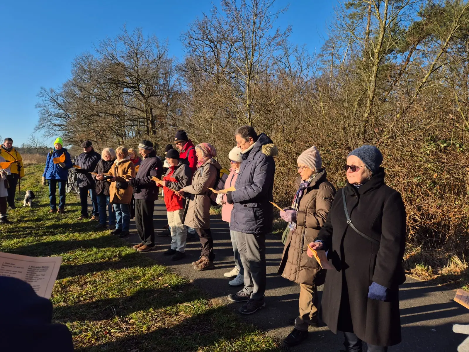 Nach dem Willkommen und ersten Lied begaben wir uns in kleinen Gruppen und munteren Gesprächen zur ehemaligen Mühle am Bieberbach. Bei winterlicher Kälte strahlte für uns der Himmel in klarem Blau und schönstem Sonnenschein … wie es passender zum Wochenspruch nicht hätte sein können: „Wir sahen seine Herrlichkeit (…)“. Ganz im Sinne des gemeinsamen Wohlergehens fanden wir zur Andacht für alle einen Platz in der Sonne.